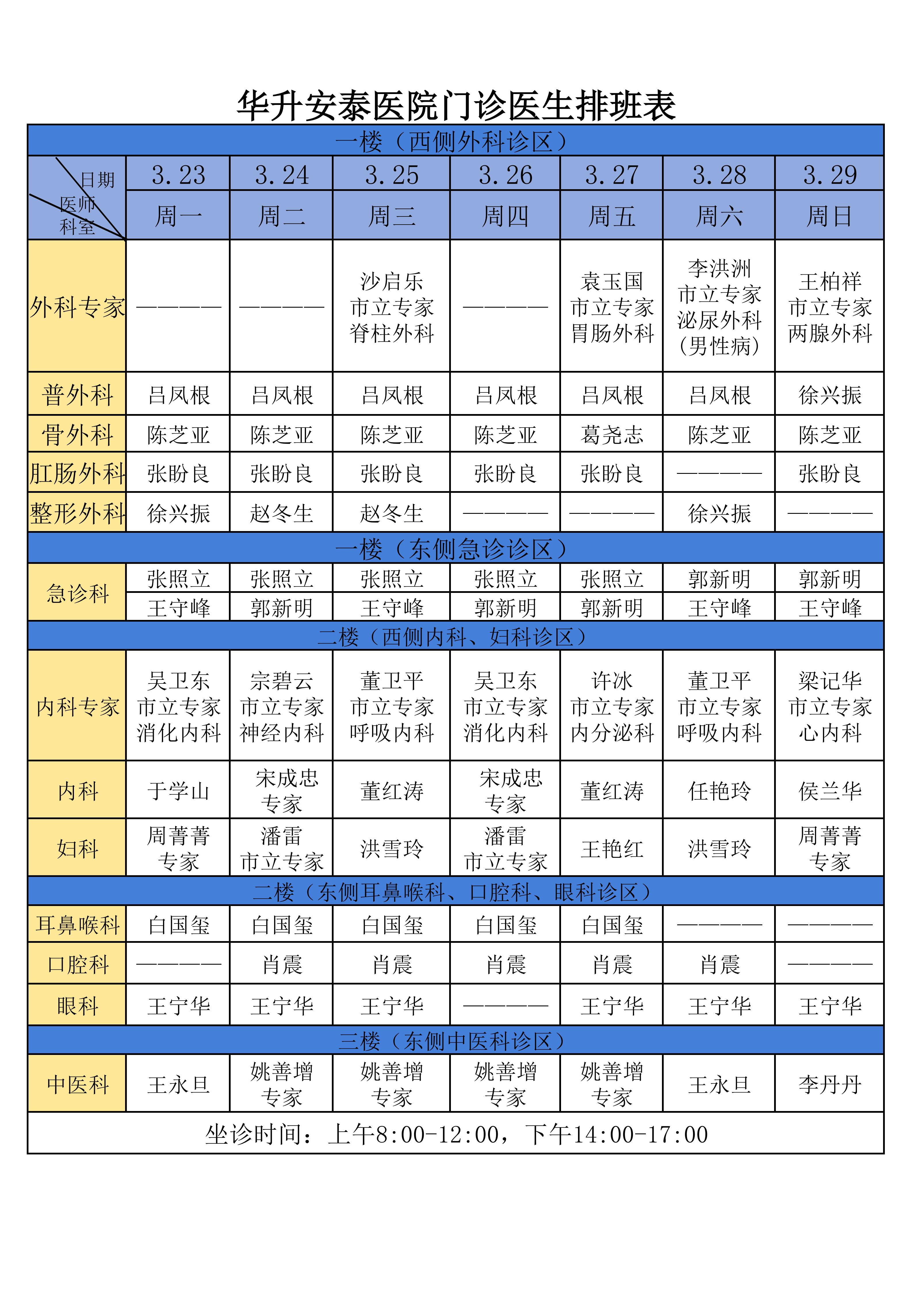 华升安泰医院3月23日-3月29日门诊坐诊信息!
